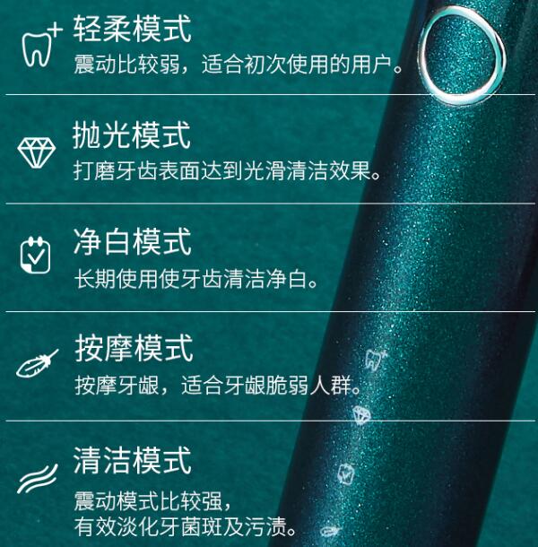 【S300 智能聲波電動牙刷】在性能上也同樣優(yōu)秀,模式記憶功能,電動牙刷停止刷牙運行后,下次即可繼續(xù)使用上次的刷牙模式,甩掉再次選擇模式的苦惱。此外,在外觀上,這款成人敏感牙齦電動牙刷也很受都市白領們的歡迎。一鍵式的全功能切換簡約設計,契合簡約美感;同時顏色的搭配上,拋開了千變一律的黑白色調,采用多種高顏值的色彩點綴,滿足不同了風格人群的使用,例如:皓月白的優(yōu)雅、睿智黑的炫酷、深邃藍的莊重及冷光藍、冷光綠的舒緩及深遠……