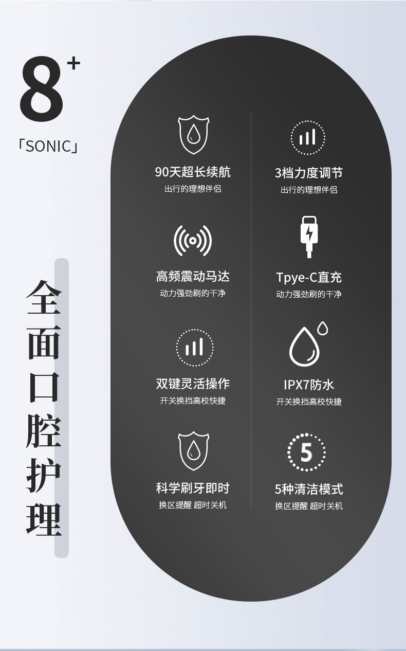 S2 聲波式差旅電動牙刷屬一款閃電快充類智能牙刷,只需5小時充電時長,便可滿足90天超長續(xù)航,簡直就是差旅必備用品。此外,這款差旅牙刷在設(shè)計(jì)上,還具有這幾大功能:五大潔牙功能,只需一鍵便可開啟“一凈到底”模式;科學(xué)智能凈齒,30秒的換區(qū)刷牙加上2分鐘的刷牙時長;檔位智能記憶模式,牢牢記住你的習(xí)慣及喜好;高磨圓處理工藝結(jié)合3D弧面設(shè)計(jì),讓你清潔有度的同時又護(hù)齦!