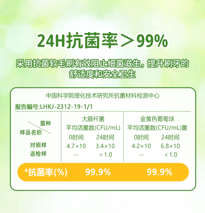 刷毛規(guī)格:0.12mm 超纖細(xì)柔抗菌軟毛,磨圓率符合兒童牙刷安全標(biāo)準(zhǔn)
