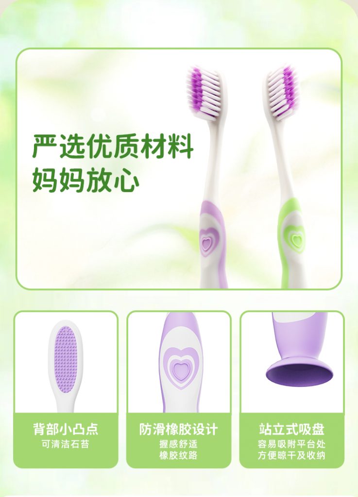 3、安全安心:食品級(jí)軟包膠 + 99.9% 抗菌認(rèn)證刷毛,無(wú)有害添加,守護(hù)孩子成長(zhǎng)口腔安全。