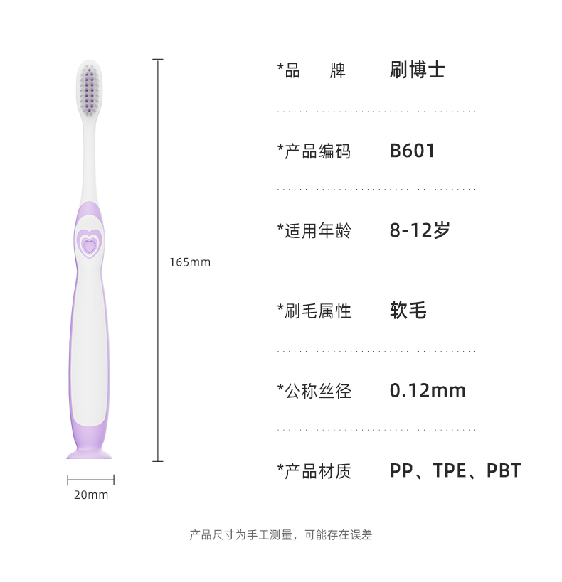 刷博士 B601 兒童可站立牙刷,采用抗菌軟毛 + 超纖細(xì)柔刷絲雙效設(shè)計(jì),高效清潔同時(shí)溫和護(hù)齦;99.9% 抗菌率認(rèn)證 + 食品級(jí)軟包膠,守護(hù)成長(zhǎng)更安心;間隔分布透氣刷面 + 吸盤(pán)式站立設(shè)計(jì),適配兒童口腔精準(zhǔn)呵護(hù);8-12 歲專屬款型,全方位守護(hù)孩子口腔健康。